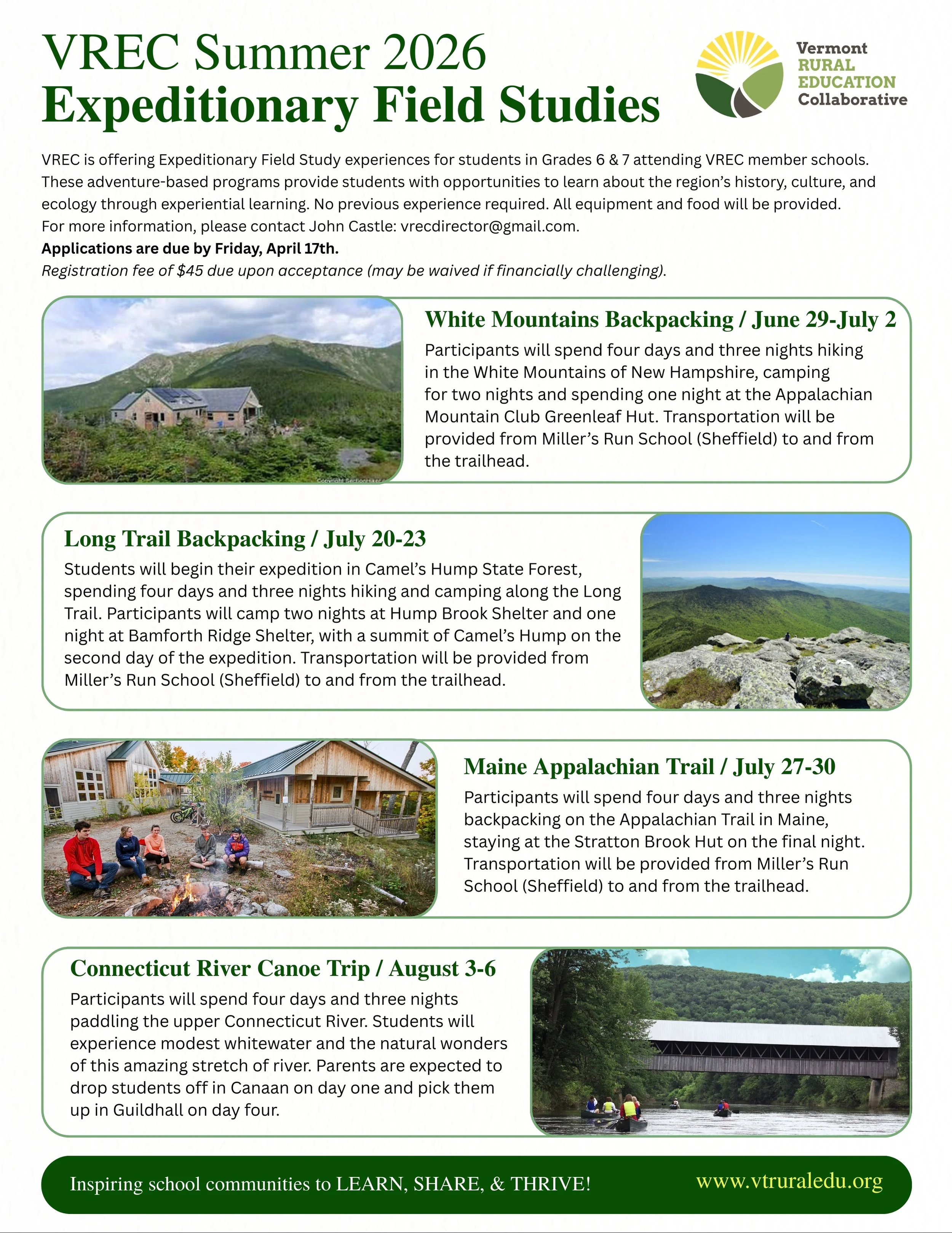 VREC launched our first expedition In the summer of 2023, with a four day canoe trip on the upper Connecticut River. During the summer of 2024, we once again conducted our Connecticut River expedition, and added a four day hiking trip in the White Mountains. In 2025 we provided both of these trips and added a Maine Appalachian Trail hike and a Maine Coast Experience trip.