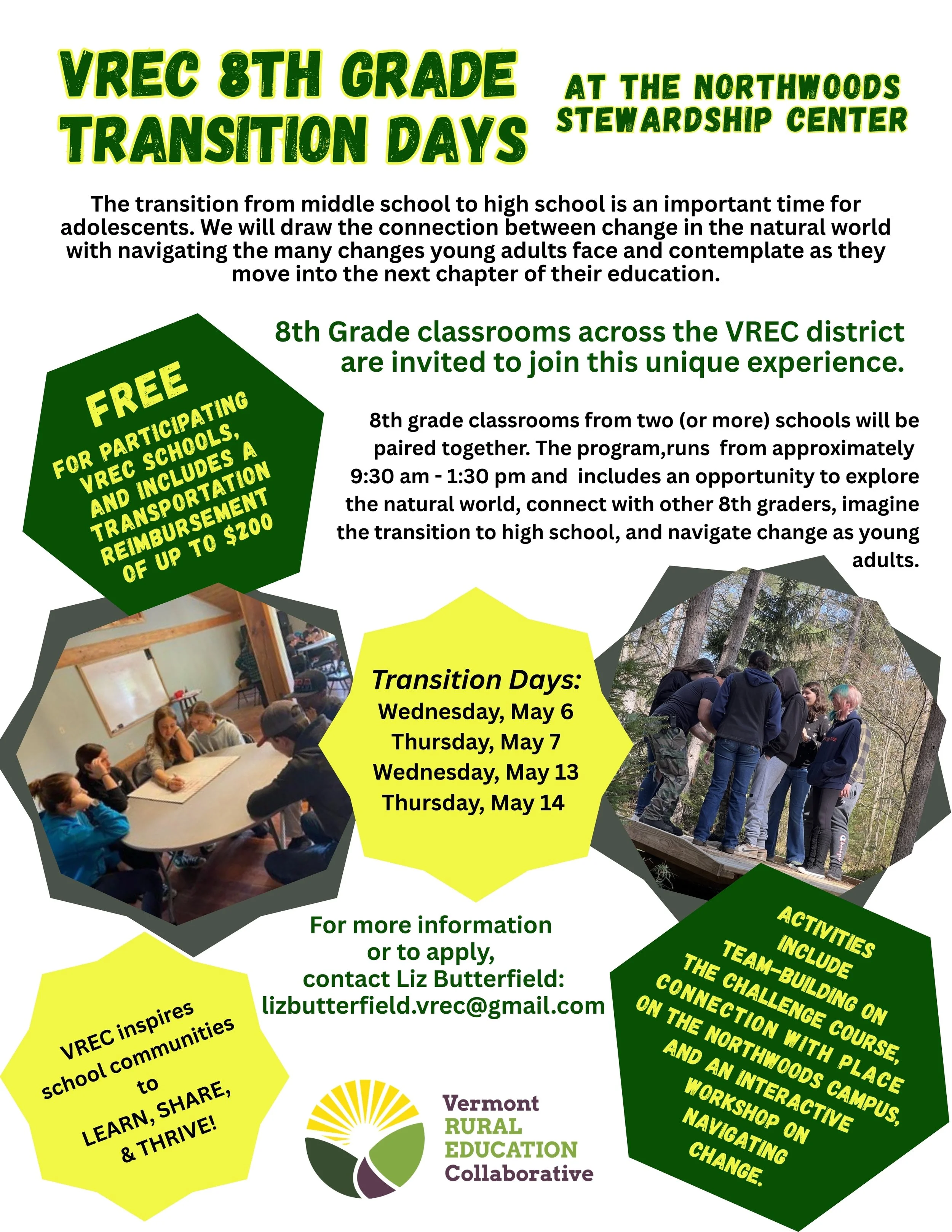 In 2025, VREC once again partnered with the Northwoods Stewardship Center to deliver dynamic leadership training for 8th-grade students. The program emphasized collaboration and inclusion, welcoming entire school cohorts to participate across three immersive training days. Schools represented included Albany, Sutton, Lowell, Burke, Coventry, Barton, Canaan, Walden, Blue Mountain, and NCUJHS.