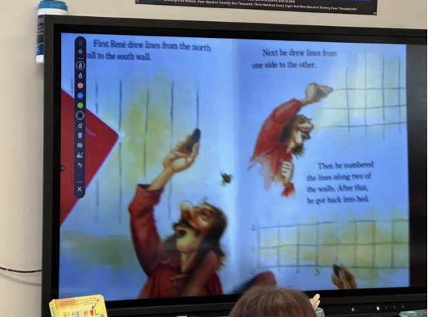 Later, after a short transitional break, I watched Amy in the classroom where she adopted the persona of French philosopher and mathematician René Descartes. Dressed in black with a thought bubble reading “I think, therefore I am,” she creatively connected historical context to the Cartesian Coordinate System, which was the subject of the class’s study. She further engaged students by reading historical fiction regarding Descartes’ motivations, supported by illustrations displayed on the SMART Board.